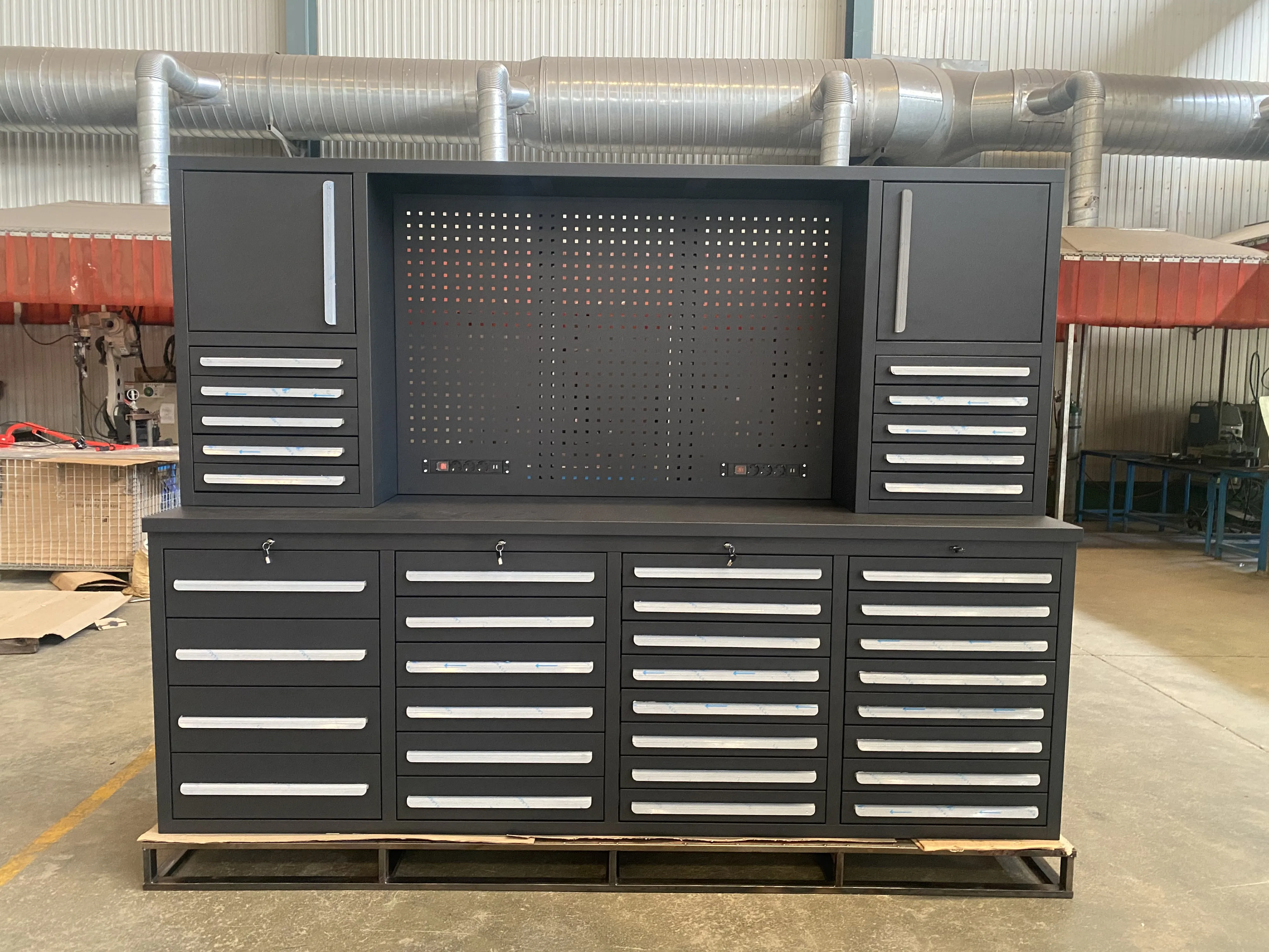 సాధన క్యాబినెట్ పొడవు 2550 మిల్లీమీటర్లు. వినియోగదారుల అవసరాలకు అనుగుణంగా మందం, రంగు, పరిమాణం మరియు డ్రాయర్లను అనుకూలీకరించవచ్చు. రాక్బెంచ్ మరియు డ్రాయర్లు రెండూ కోల్డ్-రోల్డ్ స్టీల్తో తయారు చేయబడ్డాయి. ఇక్కడ రెండు పవర్ స్ట్రిప్ ఉన్నాయి. డ్రాయర్లలో ఎల్ఈడీ లైట్లు ఉన్నాయి, ఎల్ఈడీ లైట్లను మెష్ ప్యానెల్పై వేలాడదీయవచ్చు, ఇది వర్క్బెంచ్లో పనిచేసేటప్పుడు లైటింగ్ను సులభతరం చేస్తుంది. డ్రాయర్లలో కుషన్లు ఉన్నాయి, ఇవి గీతలు సమర్థవంతంగా తగ్గిస్తాయి.