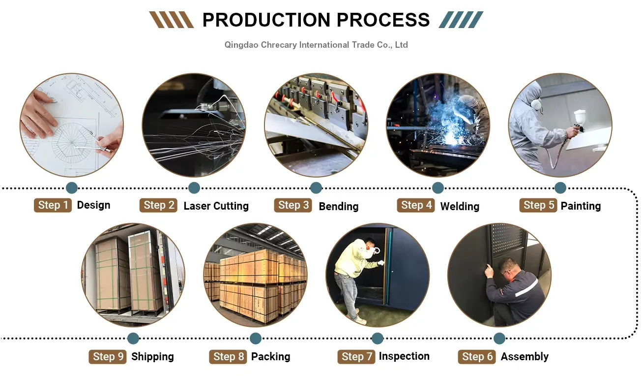 1. ముడి పదార్థాల సేకరణ: భౌతిక బలం మరియు మొండితనం అధిక ప్రమాణాలకు అనుగుణంగా ఉండేలా అధిక-నాణ్యత కోల్డ్-రోల్డ్ స్టీల్ ప్లేట్లు ప్రధాన పదార్థంగా జాగ్రత్తగా ఎంపిక చేయబడతాయి. అదే సమయంలో, డ్రాయర్లు, తాళాలు మరియు కాస్టర్లు కోసం బాల్ బేరింగ్ స్లైడ్లు వంటి వివిధ అధిక-నాణ్యత సహాయక పదార్థాలు కొనుగోలు చేయబడతాయి.